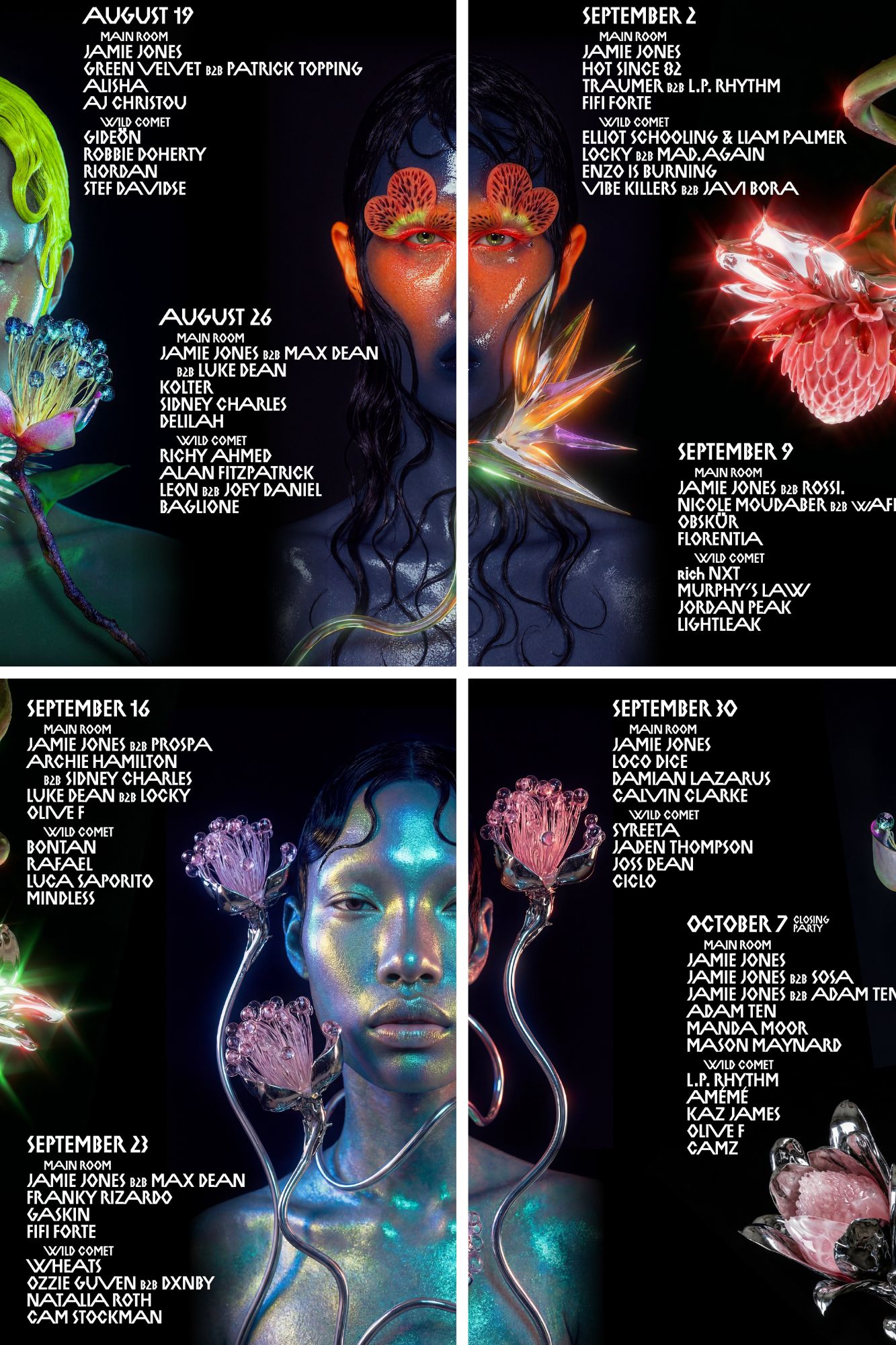 Arranca el mes el 5 de agosto en la Main Room con Jamie Jones B2B Chris Stussy, Archie Hamilton B2B Fleur Shore y Joe Rolét. Y en Wild Comet el talento se abrirá paso con Manda Moor, Seb Zito, Late Replies y Marian.  El 12 de agosto en la Main Room será el turno de Jamie Jones B2B Loco Dice, Hot Since 82, Chelina Manuhutu y Antss, escoltados en Wild Comet por Elliot Schooling & Liam Palmer, Mad.Again, Joey London Style y Flowfat.