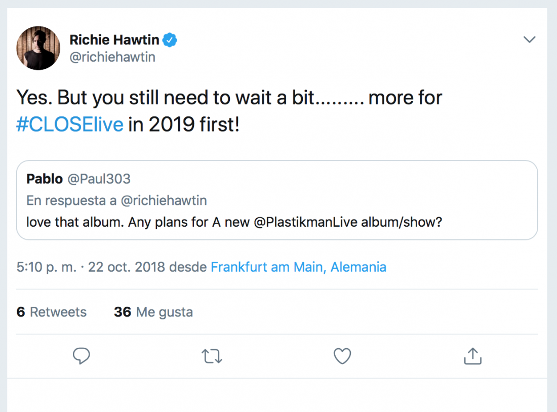 Hawtin actualmente esta embarcado en su proyecto Close y tiene programadas diferentes actuaciones y shows durante lo que queda de 2018 y 2019.