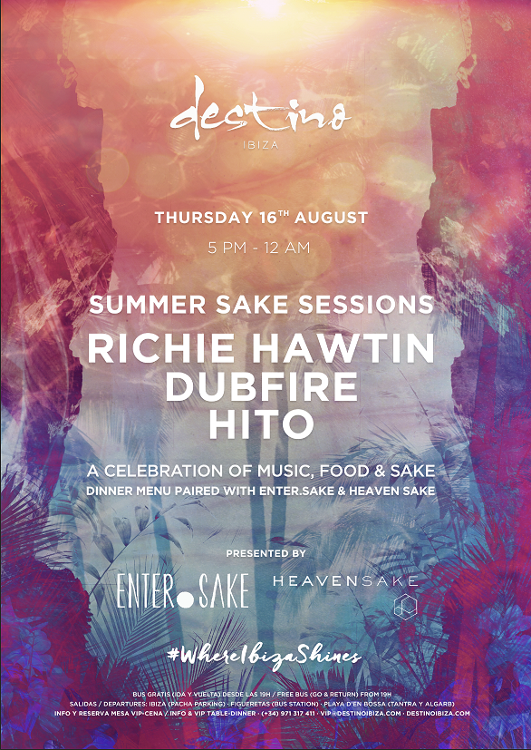Richie Hawtin dice: «La conciencia de Sake se ha desarrollado mucho desde que presentamos por primera vez ENTER.Sake en nuestros eventos en Ibiza hace más de cinco años. Muchos amigos y fanáticos están comenzando a apreciar realmente la belleza de combinar Music & Sake juntos y este agosto regresamos a la isla por una tarde para reunir todo de nuevo en Destino».