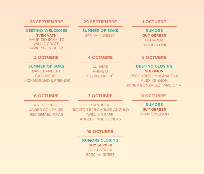 A lo largo del verano, han pasado artistas como el propio Solomun, Luciano, Guy Gerber, Maceo Plex, Pete Tong, the Heritage Orchestra, Bedouin, Damian Lazarus, Dj Sneak, Todd Terry y un largo etc. Aquí os dejamos la programación completa para estas últimas semanas de temporada.