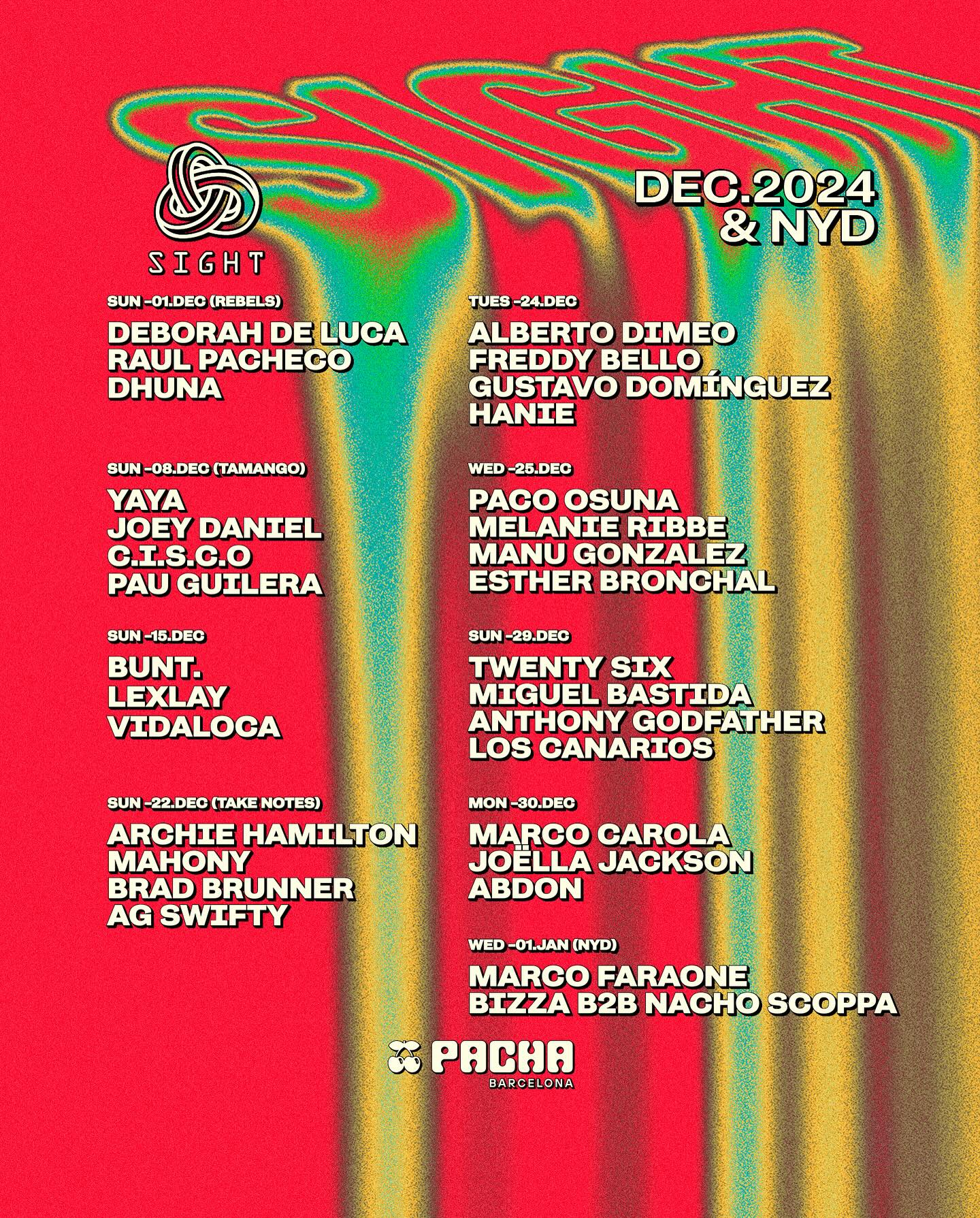 SIGHT, una de las fiestas más emblemáticas de la ciudad condal y que se celebra cada domingo en Pacha Barcelona, ha anunciado una programación excepcional para cerrar 2024 y dar la bienvenida a 2025. El domingo 1 de diciembre, la italiana Deborah De Luca inaugurará el mes, seguida de una serie de eventos que contarán con artistas de renombre como Yaya, BUNT., Paco Osuna, Archie Hamilton y Marco Carola. Para recibir el año nuevo, el 1 de enero de 2025, se presentará Marco Faraone, asegurando una celebración inolvidable.