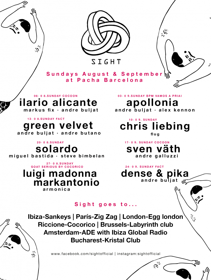 Dyed Soundorom, Dan Ghenacia y Shonky bajo su proyecto común Apollonia, habitual de clubes como Panorama Bar, DC10 o Fabric, abrirán el mes de septiembre el domingo día 3 junto a André Buljat y al siempre ecléctico e inclasificable Alex Kennon. El laureado Chris Liebing, una de las figuras más icónicas de la escena alemana desde los años ´90, llegará el domingo 10 y lo hará junto al argentino residente en Barcelona Flug. SIGHT tendrá tiempo para recibir a otra de las leyendas vivas de la electrónica internacional el domingo 17, nos estamos refiriendo por supuesto a Sven Väth, creador de Cocoon, a quien acompañará el también alemán Andre Galluzzi. Y el domingo 24 de septiembre cerrarán el mes el dúo londinense Dense & Pika con su Techno de corte analógico y pesado.