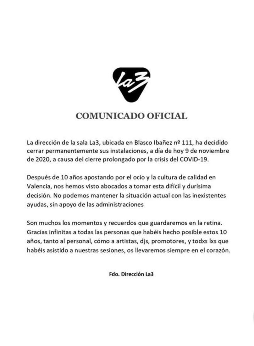 Aquí os dejamos el comunicado de La3, otra víctima de la música y la cultura que se cobra la actual situación en nuestro país. Desgraciadamente no serán los únicos, han sido ya muchos los clubs que han anunciado los estragos que están sufriendo en estos momentos sin poder abrir y sin ayudas.