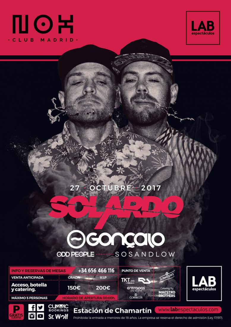 NOX, la sesión que ha hecho de los viernes madrileños su feudo particular situándose como un auténtico imprescindible del circuito nocturno electrónico de la capital, cerrará el mes de octubre el próximo día 27 en su emplazamiento habitual en LAB espectáculoscon el dúo inglés SOLARDO como cabeza de cartel.