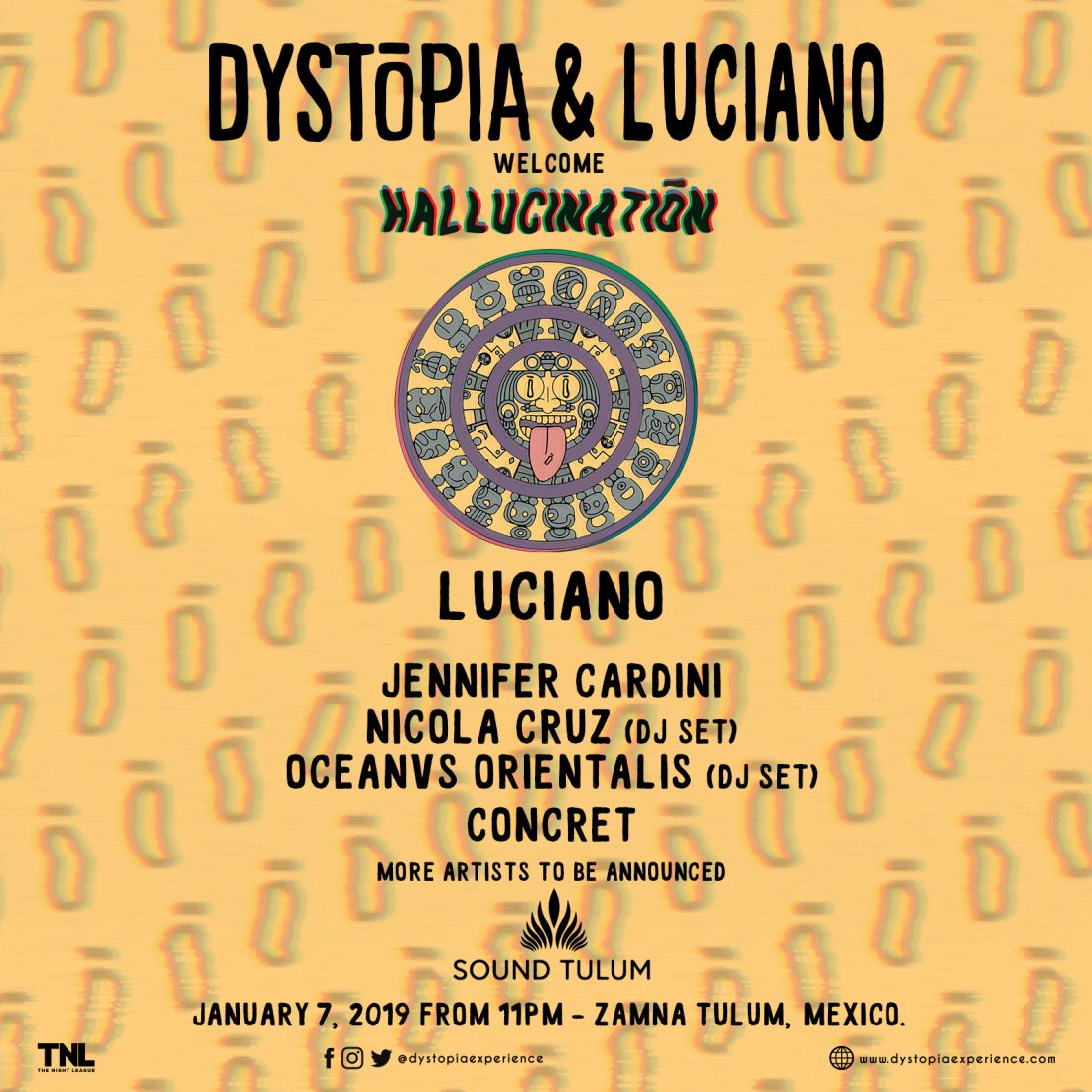 El lunes 7 de enero DYSTOPIA prepara su debut mexicano con la temática «Hallucination«. La celebración será en Zamna Tulum con Luciano como maestro de ceremonias. El chileno afincado desde hace años en Suiza es uno de los artistas más respetados de la industria electrónica internacional. Además de ser creador de Cadenza, el que fuera uno de los sellos más influyentes, posee una de las trayectorias más prolíficas como productor unida a una aún más exitosa como DJ. A él se unirán otros visionarios: Jennifer Cardini, Nicola Cruz, Oceanvs Orientalis y Concret, figuras indiscutibles y destacadas de la primera línea electrónica contemporánea, y todavía hay más nombres por anunciar.