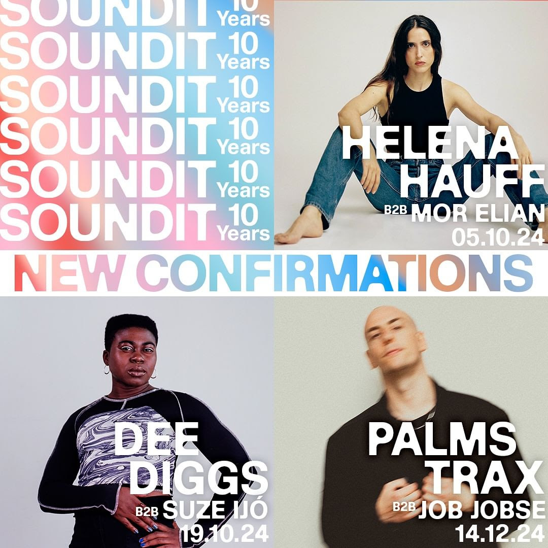 SOUNDIT anuncia nuevos nombres que completan el cartel de sus últimas cinco fechas del año. Un 2024 en el que el festival ha subido aún más la apuesta para celebrar su 10º aniversario con el mejor line up de su historia. Artistas destacados del panorama internacional como Helena Hauff, Dee Diggs y Palms Trax, que se unen a los ya anunciados Mor Elian, Suze Ijó y Job Jobse en formato b2b para completar el cartel de su segunda temporada, que se estrenó el pasado 20 de Julio con el primer Reflejos con Jeff Mills, que obtuvo un gran éxito de convocatoria. El festival retomará su actividad en La Monumental el próximo 5 de octubre, además del 19 de octubre, 9 y 23 de noviembre y 14 de diciembre. Un total de cinco citas que conforman una propuesta electrónica de calidad, que trae a nuestra ciudad a grandes artistas de la escena electrónica global, convirtiéndose en una opción de ocio diurno favorita de los barceloneses. Otros nombres que también serán protagonistas de esta recta final son Or:la, Pariah, Octave One, Eris Drew, Octo Octa, Ron Trent y Sadar Bahar, entre muchos otros, artistas encargados de cerrar una temporada 2024 para recordar.