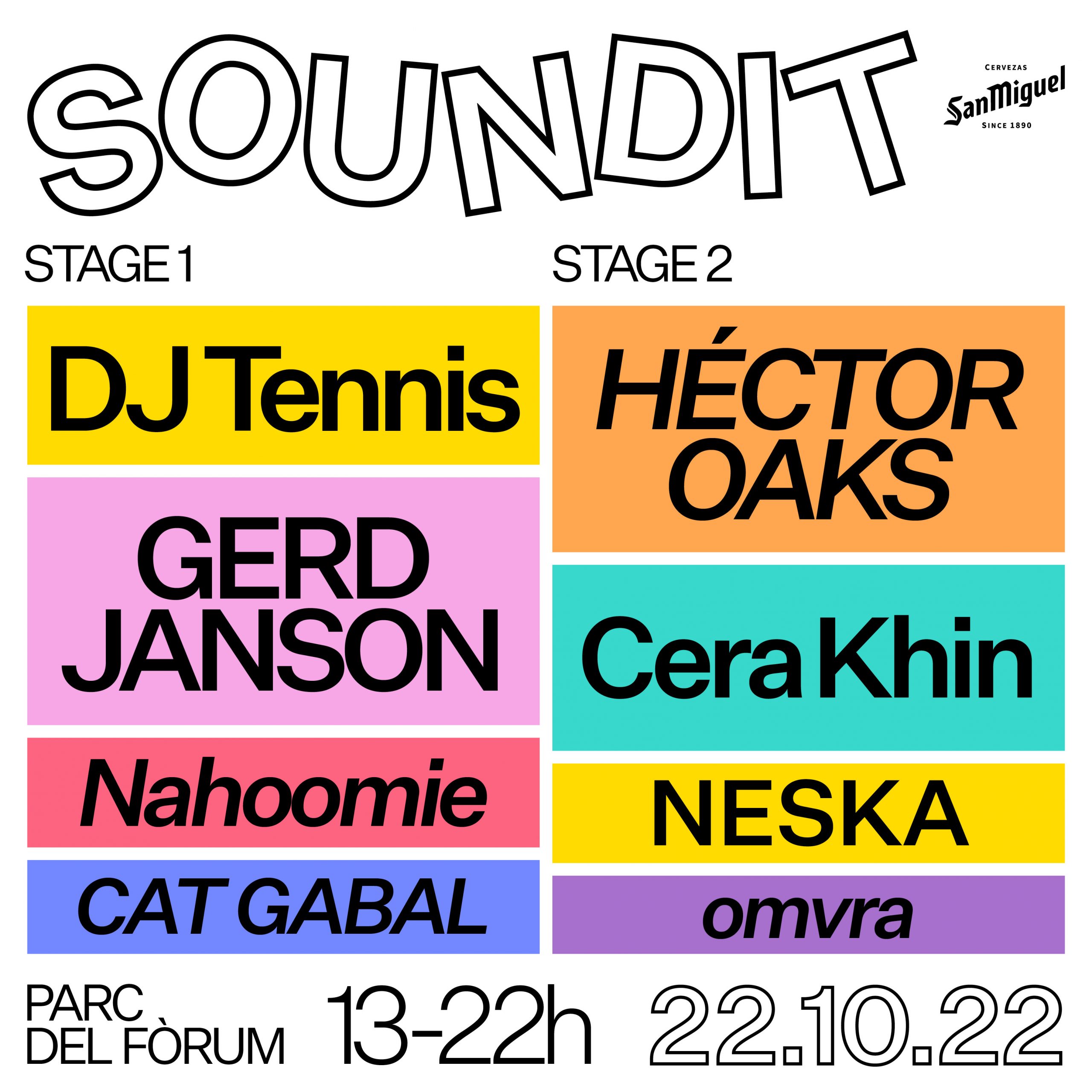 SOUNDIT cierra temporada este sábado 22 de octubre y lo hace en una de sus localizaciones más aplaudidas: el Parc del Fòrum. Esta celebración se llevará a cabo de durante 9 horas (de 13:00 a 22:00) en dos escenarios y con nueve artistas, entre los que encontramos a cabezas de cartel como Cera Khin, DJ Tennis, Héctor Oaks y Gerd Janson.