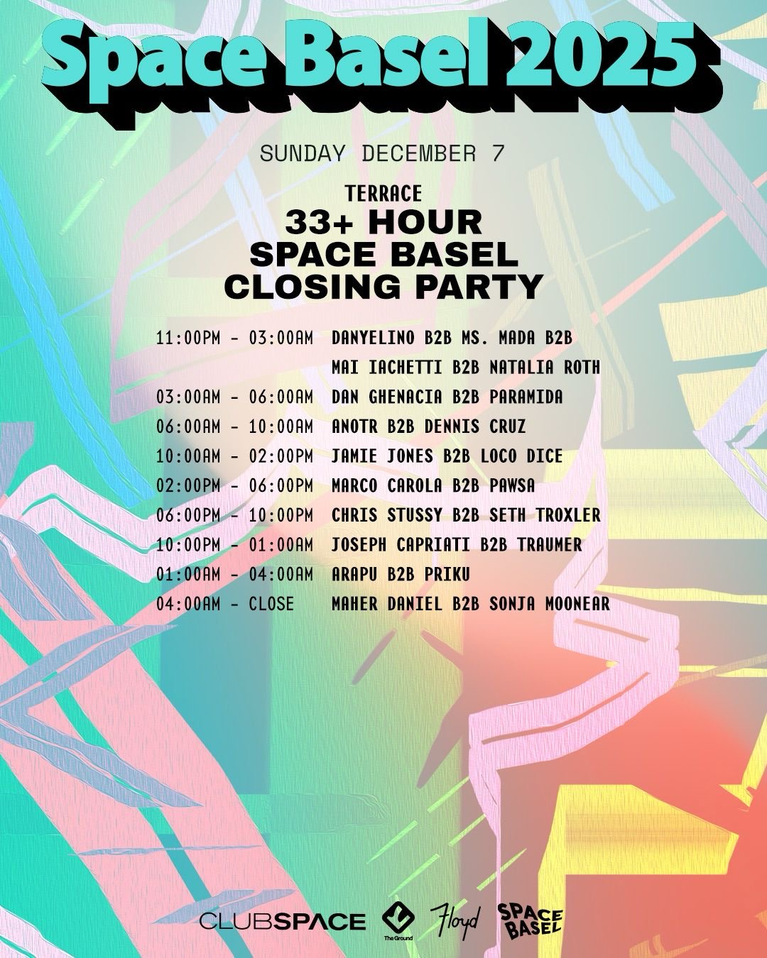 Space Basel 2025 despedirá su edición más ambiciosa con una fiesta de clausura de más de 33 horas ininterrumpidas, uno de los cierres más extensos y emblemáticos del circuito global. La Terraza de Club Space será el escenario de una verdadera maratón que reunirá a algunos de los nombres más influyentes de la música electrónica contemporánea, creando un final épico para la Miami Art Week.