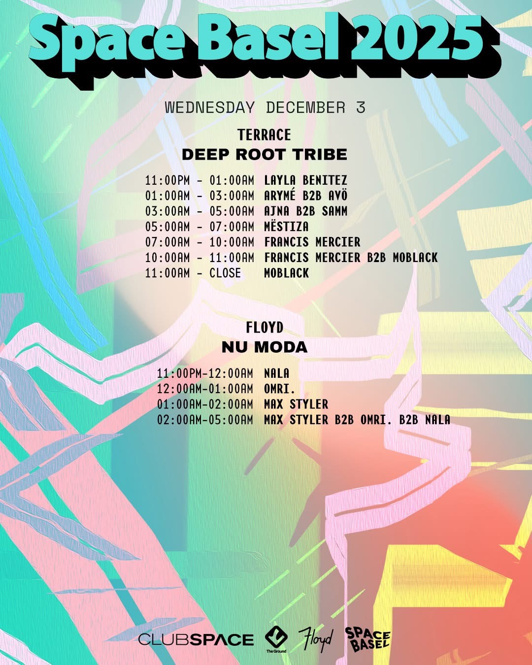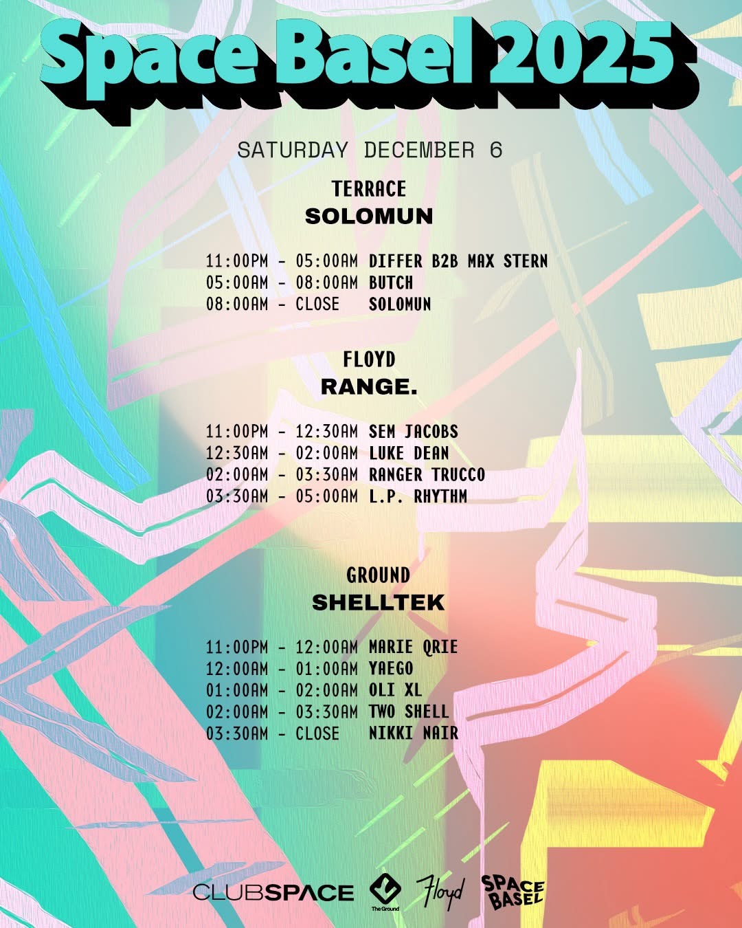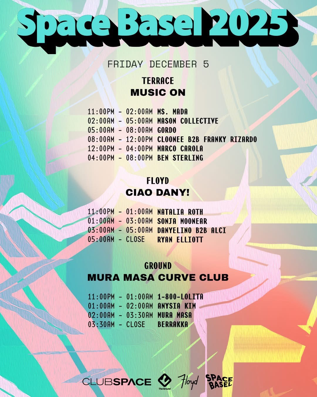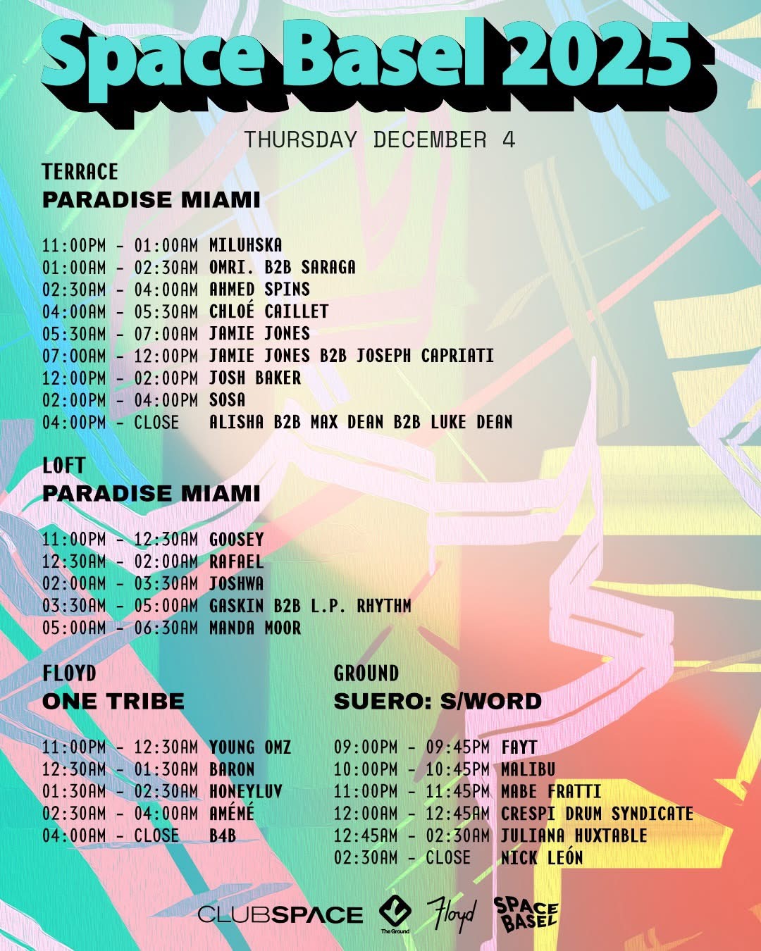 Space Basel 2025 prendió motores ayer en Miami con las primeras fiestas especiales ligadas a la Miami Art Week y, desde hoy, entra de lleno en su tramo más intenso: cinco noches consecutivas de programación repartida entre la Terraza, Floyd y The Ground de Club Space con maratones que se prolongarán hasta bien entrada la mañana y una clausura de más de 33 horas ininterrumpidas.
