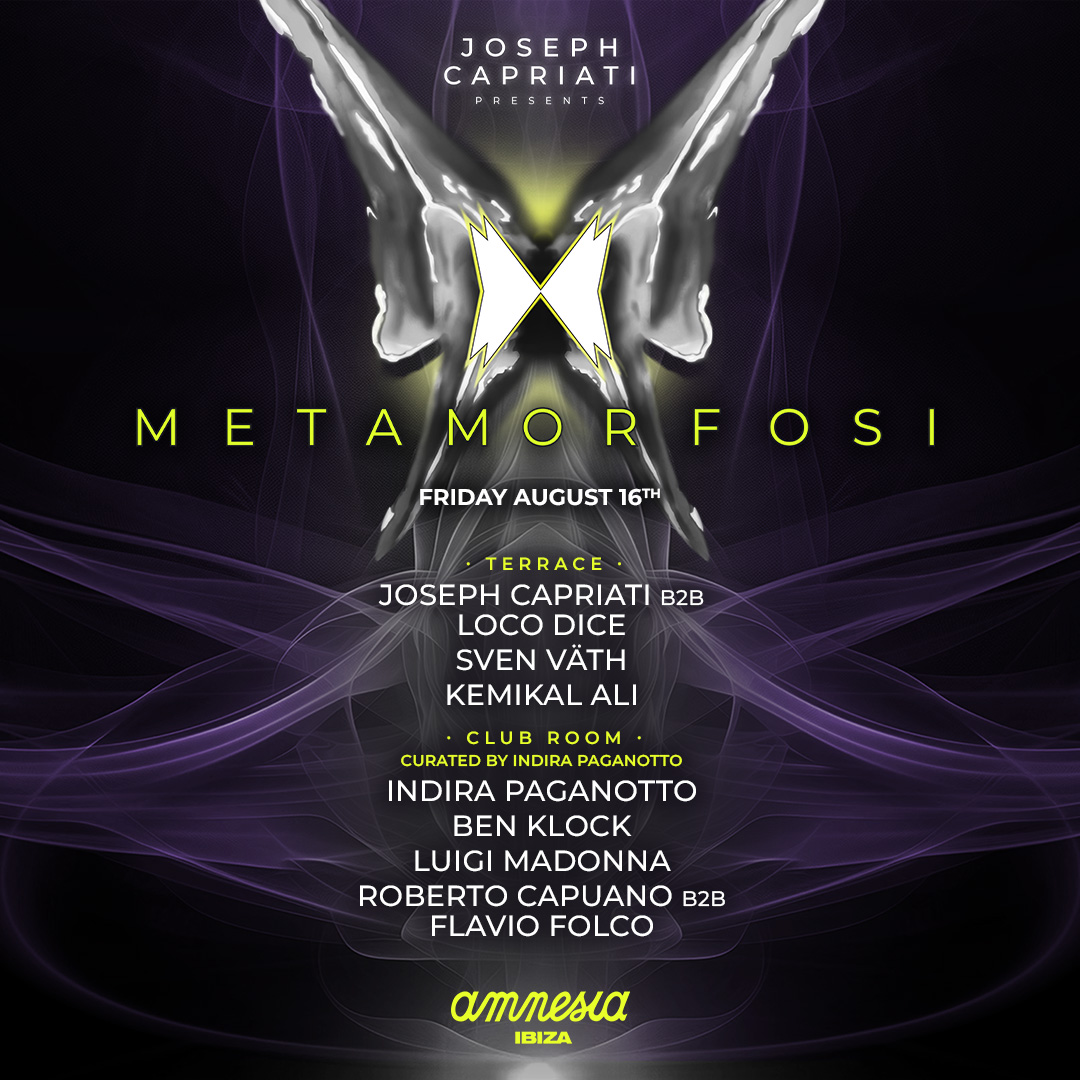 Y para terminar con este line up de ensueño tendremos al gurú de la fiesta, Joseph Capriati un artista que se ha construido a sí mismo, un trabajador incansable de la escena y un genio a la hora de entender cómo llegar al corazón de los clubbers. Su técnica es depurada y su energía es sumamente contagiosa, una energía que ha conseguido crear un concepto como el de Metamorfosi y hacerlo realidad.