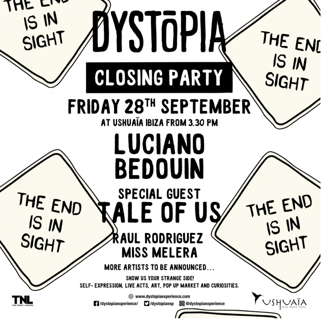 En el closing, en su despedida, Tale Of Us, serán los invitados especiales, junto al residente Luciano, y los habituales: Bedouin, Raúl Rodríguez y Miss Melera que se harán cargo de los escenarios al aire libre de DYSTOPIA en la fiesta de clausura del 28 de septiembre.