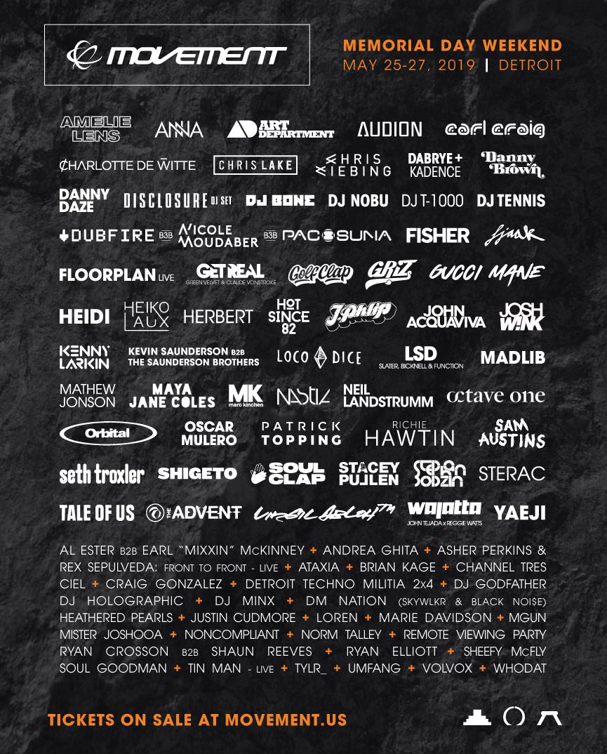 Orbital, Carl Craig, Kenny Larkin, Kevin Saunderson, The Advent, Richie Hawtin, Josh Wink o los españoles, Oscar Mulero y Paco Osuna, son algunos de los artistas que forman parte del increíble line up de Movement Detroit 2019.