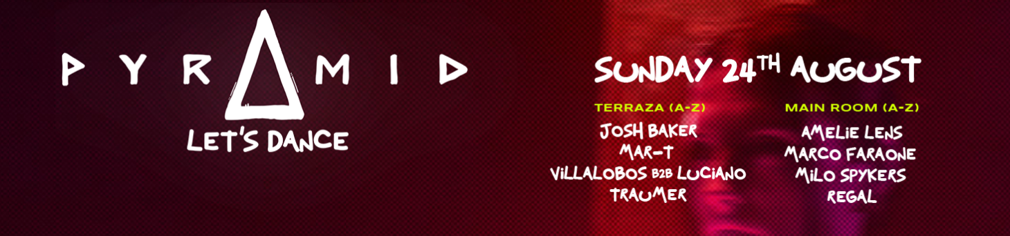 Pyramid promete otra noche histórica. Hoy domingo 24 de agosto, Pyramid reúne a lo mejor de la electrónica. En la Terraza destacan Josh Baker, Mar-T, Traumer y el explosivo Villalobos b2b Luciano. En la Main Room, el techno se impone con Amelie Lens, Marco Faraone, Milo Spykers y Regal. Una cita imprescindible para bailar sin pausa.