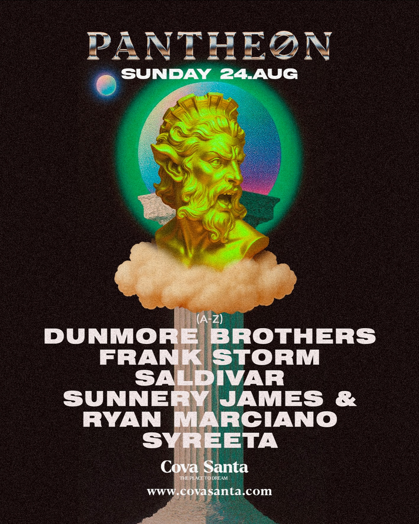 La cueva mágica de Sant Josep, Cova Santa presenta un domingo más, Pantheøn, una experiencia donde la música se mezcla con la naturaleza. En cabina estarán Sunnery James & Ryan Marciano, los carismáticos Dunmore Brothers, Frank Storm, Saldivar y Syreeta, en una jornada que combina house y techno al aire libre.