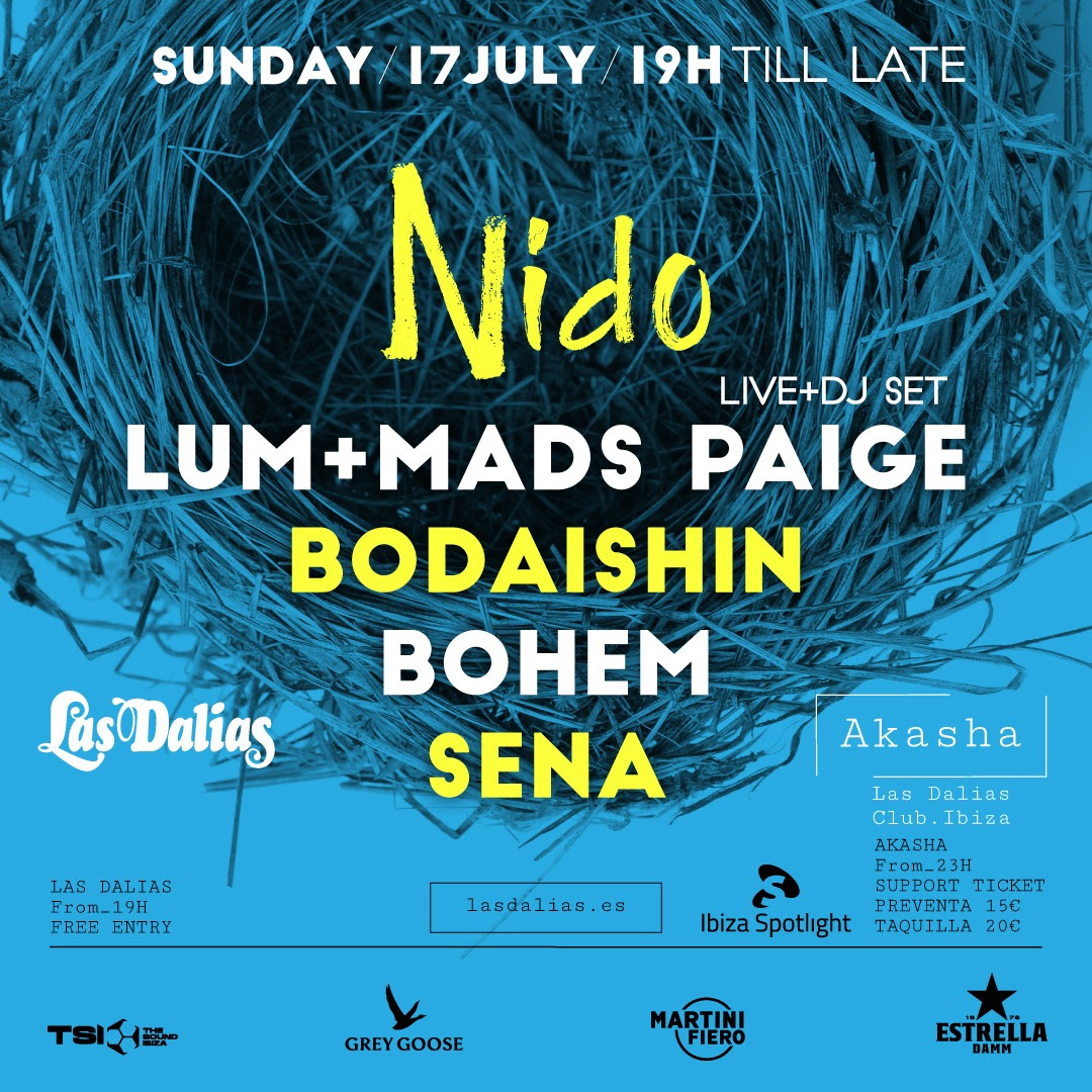 La residencia de NIDO se destaca por comenzar en el jardín de Las Dalias en formato Live Music (from 19h/ Free Entry) para continuar luego en la sala de Akasha (from 23h/ Support Ticket) en versión dj set.