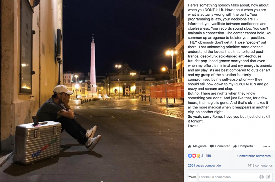 El artista ha publicado un post en su cuenta de Facebook, en el que pide perdón por su mala sesión en Roma, un lugar al que ama, pero en el que no encontró la magia necesaria para realizar una buena sesión. Este tipo de declaraciones deberían de ser mas habituales y que los propios artistas supieran reconocer cuando han realizado un buen set y cuando no.