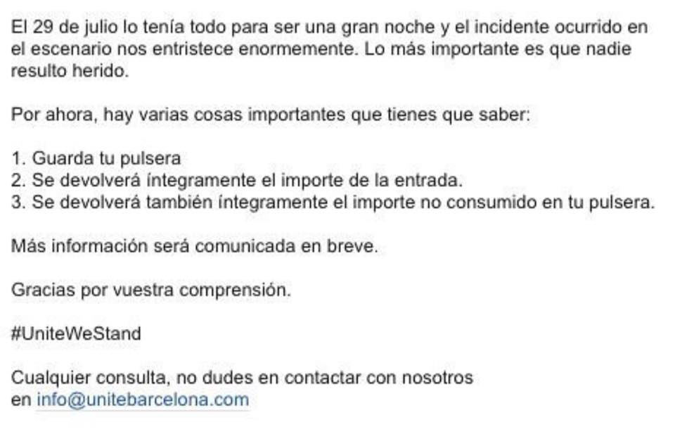 Lo que si ya es oficial. Es que los organizadores devolverán el dinero de las entradas de los asistentes. Hace escasos minutos, se ha lanzado este comunicado, para tranquilidad de los asistentes que se quedaron sin poder disfrutar del “festival” al 100%.