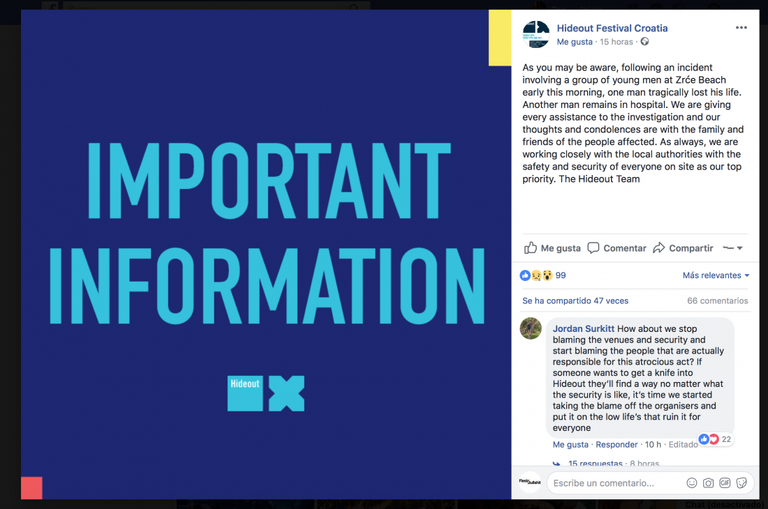 El festival por su parte ha lanzado un comunicado en su pagina web, mostrando las condolencias a la familia del asesinado.