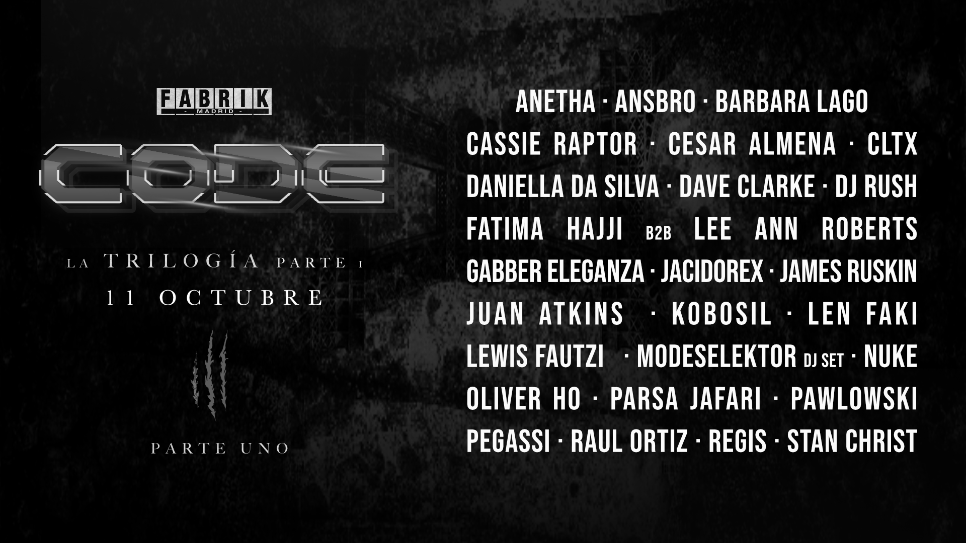 UNA NOCHE DE TECHNO SIN DESCANSO CON MÁS DE 30 ARTISTAS EN LA PARTE 1 DE LA TRILOGÍA DE CODE EL PRÓXIMO 11 DE OCTUBRE EN FABRIK.