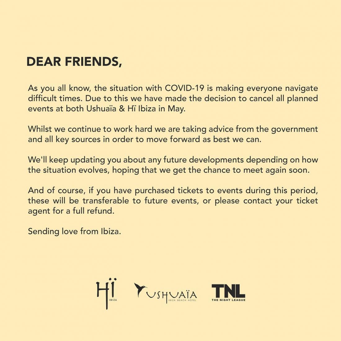 USHUAÏA Y HÏ IBIZA CANCELAN TODOS LOS EVENTOS DEL MES MAYO