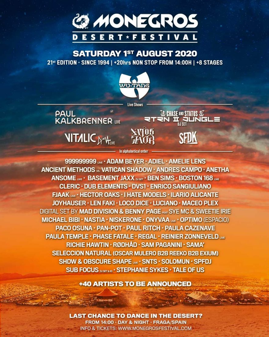 Tras las primeras confirmaciones del festival del desierto de Fraga con Richie Hawtin, Paul Kalkbrenner, Amelie Lens, Chase & Status y el rap de Natos y Waor, hoy 4 de febrero, Monegros ha dado a conocer una gran parte de su line up para este 2020, entre ellos sus cabezas de cartel con Wu-Tang Clan, que firman algunos de los mejores discos de rap de las últimas tres décadas. El hip hop de SFDK, y el nuevo live de Vitalic también se unen al festival. El techno tampoco faltara en Monegros con nombres míticos como: Ben Sims, Oscar Mulero con el dj set de Selección Natural, Len Faki o Adam Beyer. Puedes ver el resto de nombres anunciados a continuación.